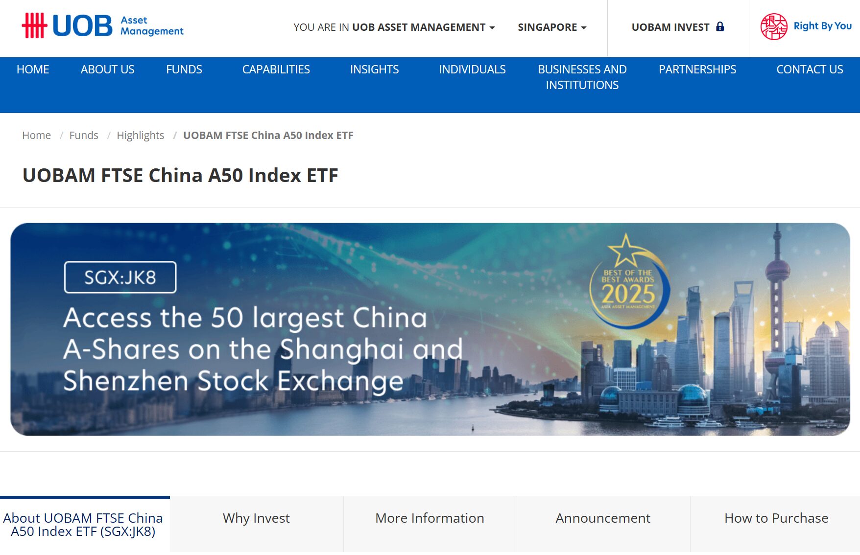 The UOBAM FTSE China A50 Index ETF is also listed on the SGX.