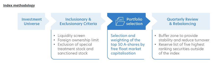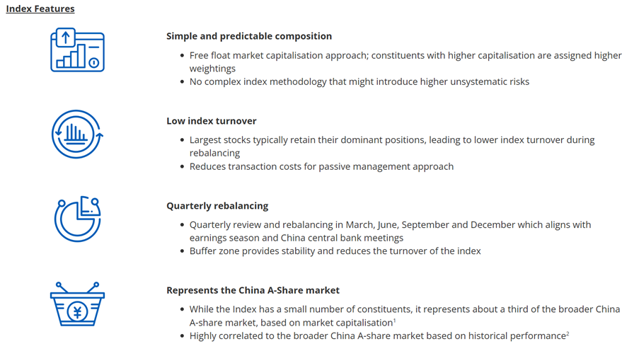 You can see more on the benefits of tracking the 50 largest A-share stocks listed on the Shanghai and Shenzhen stock exchanges below: