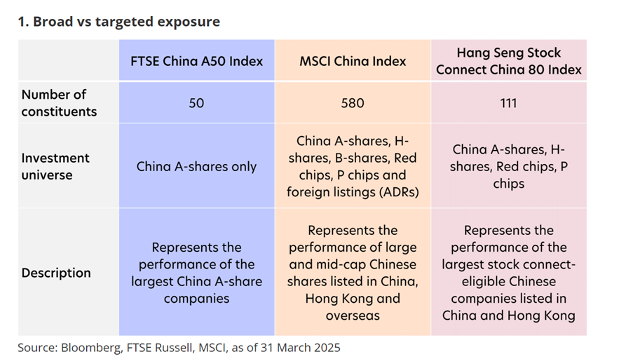 - For investors seeking to invest in a wide array of sectors and stocks ranging from mid-cap to mega-cap, and both onshore and offshore-listed securities, the MSCI China Index may be well-suited.